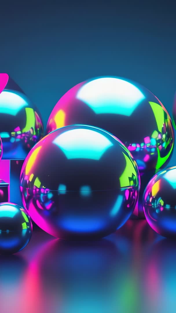 AI Generated Image. Video showing central neon sphere reflecting cyan, magenta, lime highlights on glossy floor, with surrounding smaller spheres creating mirrored symmetry. Lighting creating rich color gradients and high-contrast reflections, producing futuristic minimal aesthetic. Working well for vertical social media ads, phone wallpapers, app intros, tech product promos, music visualizers, motion graphic backdrops, title sequences, event visuals. Footage is loopable and crop-safe for mobile, allowing easy color grading, speed ramping, and overlaying of text or logos. Use for branding, UI demos, product reveals, promotional reels, or abstract backgrounds in modern design projects.