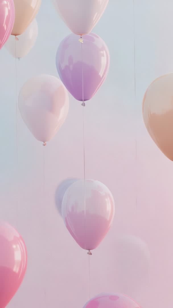 AI Generated Video. Vertical video showing glossy pastel balloons ascending slowly against soft blue and pink sky. Central pair lingering longest, creating gentle focal point while surrounding balloons drifting out of frame. Thin strings and subtle reflections adding delicate realism. Soft pastel palette featuring pink, lavender, peach delivering serene, whimsical mood. Serving well for vertical social media reels, mobile wallpapers, event invitations, party promotions, baby shower or wedding visuals, and lifestyle advertising. Serving as background for text overlays, animated title cards, countdowns, product reveal sequences, and looping screens. Encouraging slow motion or seamless loop editing to extend calming ambience and reinforce brand friendliness.