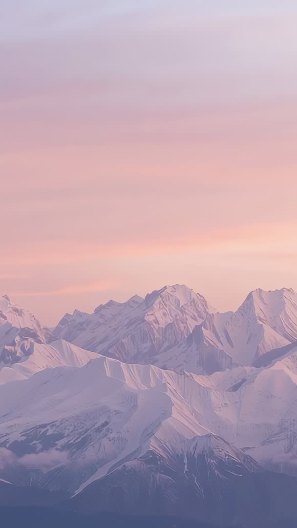 AI Generated Image. Vertical clip showing pastel sky melting into warm pink over snow-covered alpine peaks, thin clouds drifting across frame. Slow camera pan revealing layered ridges, sharp summits, soft shadow patterns on snow. Color palette offering gentle pinks, lavenders and cool blues for serene cinematic mood. Use as vertical background for mobile apps, social media stories, reels, travel promos, meditation videos, product hero shots and lock screen wallpapers. Looping-friendly composition, room for lower third titles, ample negative space in upper portion for text overlay. Suitable for nature features, mountain tourism campaigns, wellness content and ambient backdrop for slow-paced video edits.
