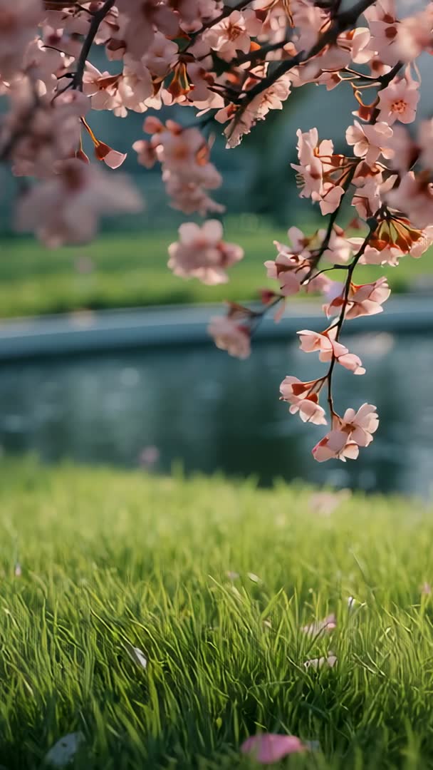 AI Generated Image. Showing close-up of pink blossom branch swaying above pond with soft petals drifting onto green grass. Creating warm backlight with bokeh highlights and shallow depth of field. Offering gentle motion and soothing pastel color palette for spring and floral themes. Serving well for meditation and wellness videos, spa and beauty promos, wedding and romantic montages, seasonal social media reels, mobile wallpaper loops, background clips for nature blogs and environmental campaigns. Supporting vertical mobile formats and looped playback for ambient displays. Suggesting slow motion playback, soft color grading, subtle ambient music, and lower-third title placement to maintain visual balance. Recommending 15-30 second loop lengths for seamless background use and providing room for text overlays and logo animations.
