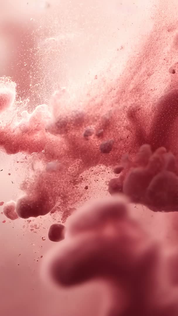 AI Generated Image. Capturing vertical slow-motion footage of pink powder cluster bursting into fine particles and forming soft abstract cloud. Emphasizing micro-fragmentation, dust flow, and swirling textures to create dreamy pastel atmosphere and tactile depth. Useful for beauty and cosmetic campaigns, fashion intros, product packaging hero shots, social media stories, mobile wallpapers, and app backgrounds. Supporting creative uses such as looping background for Reels and TikTok, motion graphics overlays, album or promo visuals, and scientific visuals illustrating fluid dynamics and particle dispersion. Technical suggestions include applying gentle color grading, subtle speed ramping, high-contrast masking for text overlays, and creating seamless loops for vertical format. Delivering cinematic, tactile feel for brand advertising, title sequences, app intros, and editorial design.