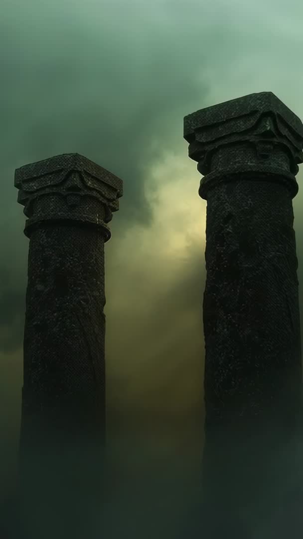 AI Generated Video. Vertical cinematic clip showing pulsing green clouds sending warm glow between two weathered stone pillars rising from low fog. Scene creating moody, mysterious atmosphere with backlit clouds, diffuse volumetric light, and deep shadows across textured stone surfaces. Strong vertical composition leaving ample negative space in upper frame for overlay text, logos, or title cards. Ideal for title sequence, cinematic trailer, fantasy or horror scene transition, social media story or reel, mobile wallpaper, museum exhibit backdrop, historical documentary opener, or game cinematic. Color grading suggestions include enhancing green tones, increasing contrast on pillars, and adding subtle vignette for extra drama. Loopable short clip working well as ambient background for websites, streaming channels, or promotional reels.