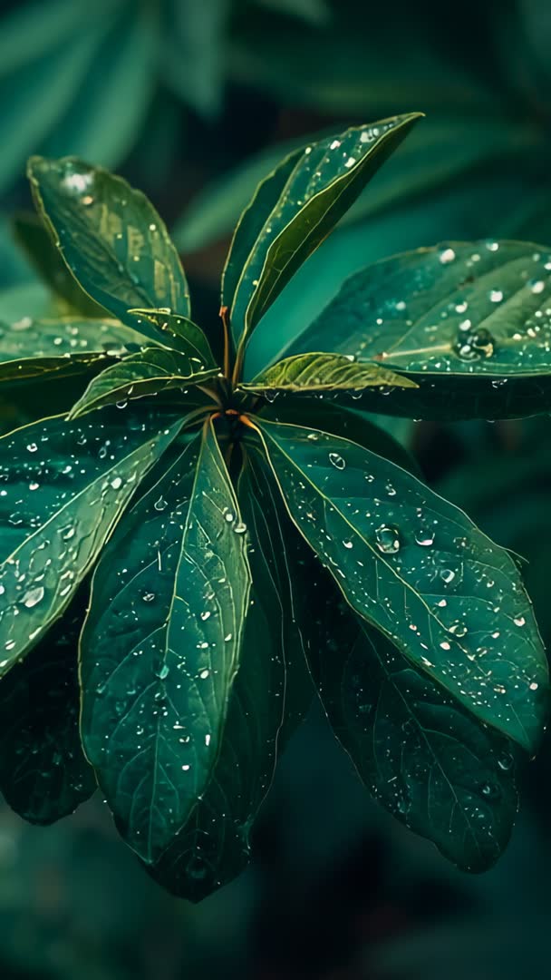 AI Generated Image. Closeup vertical clip showing rain-kissed broadleaf leaves with glistening water droplets and gentle focus shift across leaf veins. Deep emerald tones and glossy surface creating moody, natural atmosphere with soft bokeh background. Slow, smooth motion capturing droplets merging and sliding along midrib, revealing surface tension and fine botanical detail. Footage working well for nature documentaries, botanical tutorials, eco product ads, spa and skincare branding, meditation and relaxation apps, website hero backgrounds, social media vertical reels, mobile wallpapers. Clip supporting seamless looping and color grading for cinematic mood. Easy to pair with ambient soundscape or soft piano for calming mood. Composition leaving negative space for overlay text or logo. Recommended usage including promoting sustainable living, herbal products, gardening content, wellness campaigns, seasonal rain features, background for product closeups, editorial layouts, presentation slides, digital signage.
