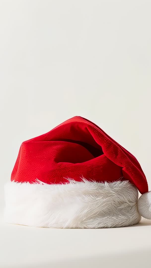 AI Generated Video. Loopable vertical 9:16 video showing red Santa hat gently settling on studio tabletop, highlighting plush velvet surface and fluffy white faux fur trim. Featuring soft neutral background and directional studio lighting for crisp fabric texture and subtle shadow. Ideal for holiday reels, social media stories, e-commerce product pages, greeting card animations, and seasonal ad bumpers. Useful for adding animated festive accent to website banners, retail displays, email headers, and in-store screens. Offering easy trimming for short clips, slow-motion breakdowns, and seamless looping. Showing shallow depth of field for subject isolation and clean composition, suitable for editorial and commercial use.