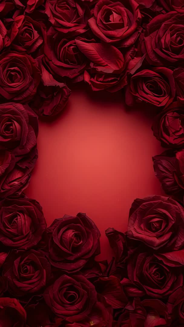 AI Generated Video. Showing ring of deep red roses forming circular border around softly lit empty center, studio-lit flatlay creating moody romantic mood. Offering vertical orientation optimized for mobile stories, reels, and portrait video ads. Providing plenty of central negative space for overlaying text, logos, animated graphics, or product placement. Working well for Valentine campaigns, wedding announcements, anniversary greetings, floral brand promotions, luxury packaging reveals, and romantic social content. Serving as looping background or short video intro with slow zoom or pan for cinematic effect.