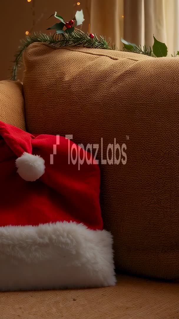AI Generated Video. Vertical video showing red Santa hat resting on brown couch with holly garland and warm bokeh lights. Shot using shallow depth of field, focusing on fabric texture and plush fur trim. TopazLabs watermark visible across frame indicating sample preview. Includes generous copy space on right for text, logo, or call-to-action overlays. Ideal for holiday social media ads, Instagram Stories, TikTok Reels, vertical video ads, seasonal product promotions, greeting card animations, blog hero headers, email marketing banners, and retail display screens. Color palette combining warm tan sofa tones with vibrant red and green accents, creating cozy seasonal mood. Suggested editing options: adding motion blur, soft glow, slow pan, or subtle zoom for cinematic feel. Watermark presence indicating sample preview; obtain clean licensed file from rights holder for commercial use. Frame orientation 9:16, optimized for mobile-first platforms and story formats.