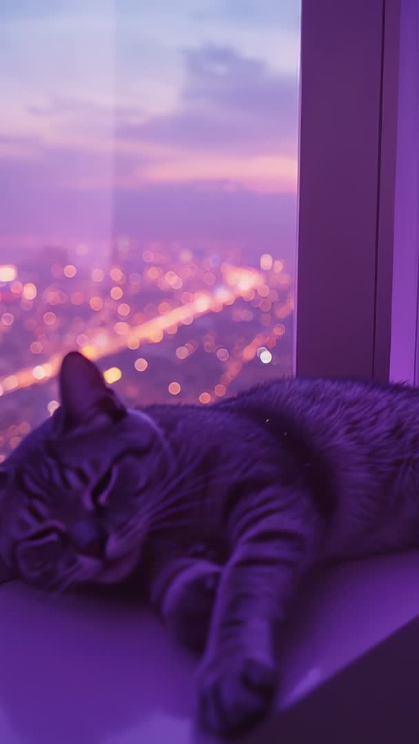AI Generated Image. Vertical video showing sleeping tabby on windowsill with soft purple bokeh from distant city lights at dusk. Foreground featuring relaxed tabby with shallow depth of field while background presenting dreamy urban light trails and pastel sky. Mood conveying cozy, tranquil evening ideal for lifestyle, wellness, pet care, and interior design projects. Use for social media reels, mobile wallpapers, blog headers, video intros, meditation or sleep app backgrounds, pet adoption campaigns, and boutique apartment advertising. Color palette offering violet and warm amber tones for cinematic, moody visuals. Clip allowing easy cropping for portrait platforms and seamless looping for ambient background use.
