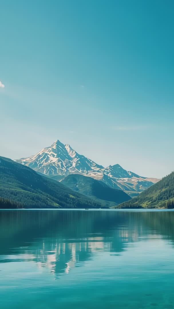 AI Generated Image. Vertical 9:16 clip capturing snowcapped peak reflecting on turquoise lake, gentle ripples forming over glassy water and pebble shoreline visible at lower edge. Pine-covered slopes and deep valley framing scene, creating sense of scale and calm. Wide negative space in upper frame providing room for text, titles, or motion graphics. Featuring cool turquoise and teal tones with bright snow highlights, soft natural light, and crisp mountain detail. Suiting mobile backgrounds, social media reels, travel promos, wellness or meditation apps, landscape documentaries, tourism campaigns, hotel or resort marketing, website hero sections, and digital wallpapers. Using as calm backdrop for quotes, product overlays, or slow-motion B-roll to enhance storytelling.