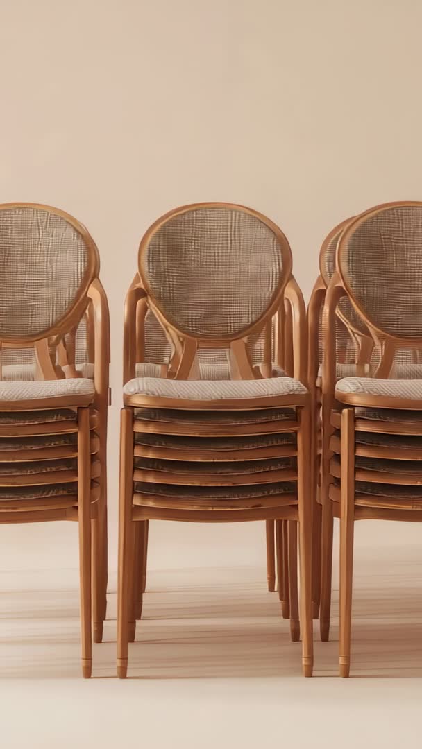 AI Generated Image. Video showing stacked timber chairs with woven cane backs and cushioned seats, framed vertically to emphasize symmetry and warm beige palette. Camera slowly panning across center stack, highlighting texture of cane weaving, timber grain, and layered seats. Composition lending itself to furniture catalog use, product demo reels, café or event marketing, interior design moodboards, and social media reels. Scene working well for ecommerce hero clips, store display videos, blog banners, and background footage for design presentations. Lighting creating cozy, neutral mood that complements sustainable and vintage furniture collections.