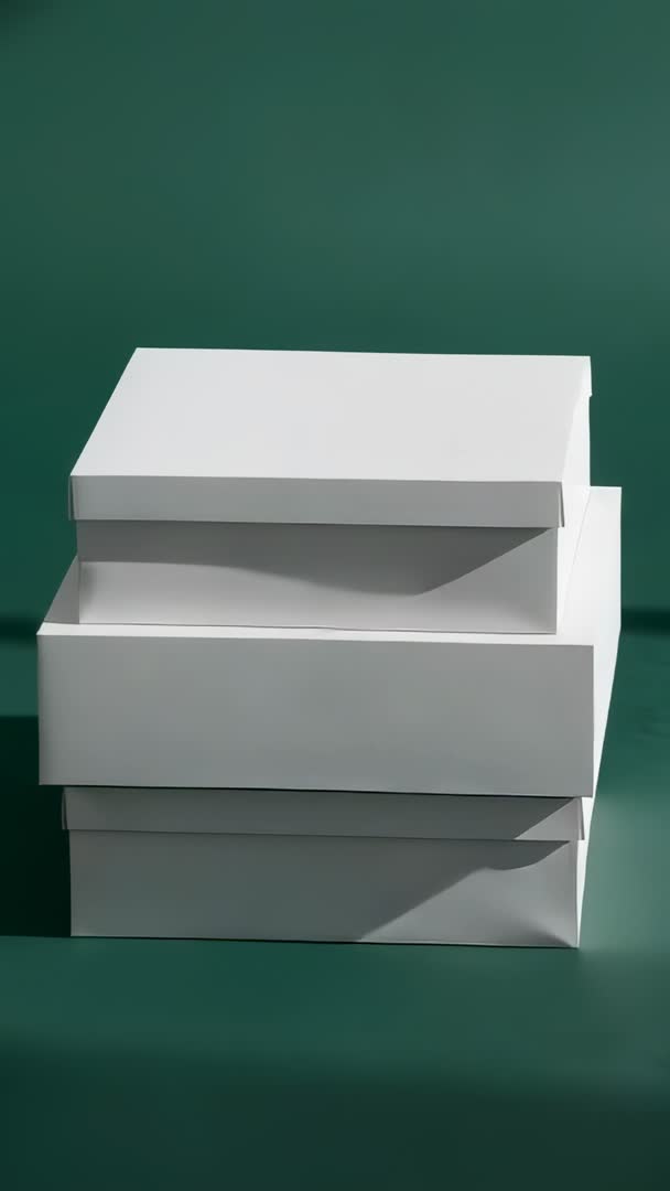 AI Generated Image. Clip showing stacked white boxes rotating slowly on deep green background while lids lift slightly to reveal interior. Minimal composition highlighting clean lines, strong shadow play, and generous negative space in upper frame for headline or logo placement. Soft studio lighting creating gentle contrast and subtle edge reflections for premium feel. Ideal for packaging mockups, product reveal sequences, ecommerce hero reels, subscription box unboxing, and sustainable brand campaigns. Deliverables suggestions: provide 9:16 vertical edits at 15s and 30s, prepare seamless loop cut for repeating playback, include speed ramp option for dramatic reveal. Creative uses: overlay bold headline in top third, place logo in lower-left safe zone, use as intro clip for product pages, vertical ads, or social media stories and reels.
