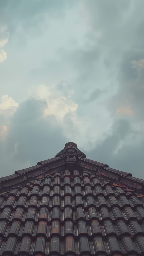 AI Generated Image. Showcasing vertical video of low-angle tiled roof with decorative ridge cap, clouds drifting across sky while sunlight shifts, creating moody atmospheric backdrop. Highlighting texture and repeating pattern of ceramic tiles for use in architecture and design projects. Suggesting use as B-roll for weather reports, real estate listings, roofing company promotions, travel videos, or social media reels. Offering seamless loop potential for backgrounds, title cards, mobile wallpapers, or calming brand intros. Recommending gentle color grading to enhance warm tile tones and cool sky contrasts, plus slow motion or time-lapse speed variations to emphasize cloud movement. Ideal for editorial layouts, website hero sections, promotional ads, and storytelling sequences needing moody outdoor visuals. Including suggested keywords tiled roof, roof tiles, ridge cap, cloudscape, vertical video to improve discoverability.