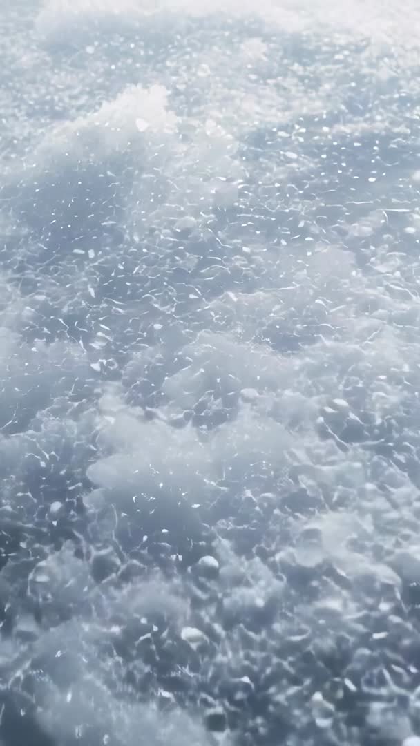 AI Generated Video. Showing vertical macro footage of white feather drifting on churning ocean foam with shimmering bubbles and delicate surface ripples. Capturing closeup patterns, texture, and fluid turbulence for striking abstract visuals. Working well as background loop for social media stories, mobile hero banners, vertical ads, and short form content. Serving cinematic overlay for title sequences, product videos, meditation apps, and environmental campaigns. Offering serene yet dynamic mood for scene transitions, website headers, and broadcast lower thirds. Delivering high contrast whites and cool blue tones for color grading and compositing. Recommending slow motion playback and seamless looping for calming effect or pairing with ambient audio for immersive experience.