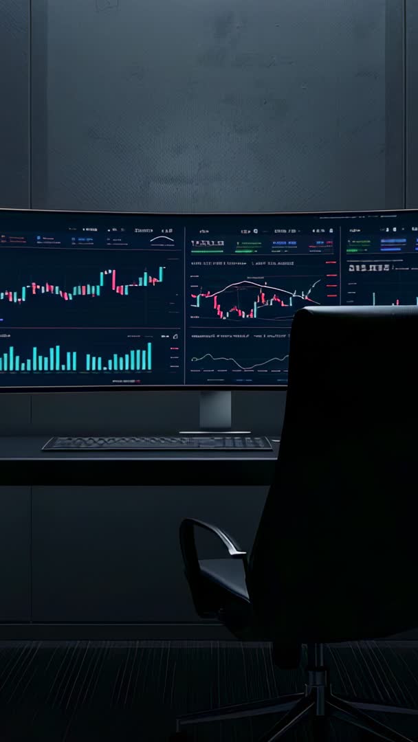 AI Generated Image. Vertical video showing dimly lit trading desk with triple curved monitors displaying live candlestick charts, line graphs, volume histograms. Camera panning across desk with ergonomic chair in foreground, keyboard and monitor stand visible. Color palette using deep navy and teal with neon chart highlights, creating focused, professional mood. Footage fitting use as background for finance app demos, trading platform promos, social media vertical ads, corporate presentations, investor pitch videos, online courses on technical analysis. Clip allowing editors to crop, add overlays, or sync to voiceover for tutorials and webinars. Ideal for hero sections, mobile-first marketing, or B-roll in financial documentaries.