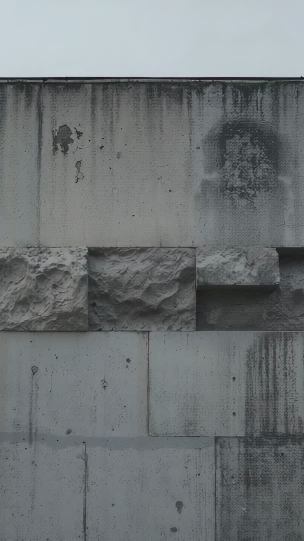 AI Generated Video. Showing close framing of worn concrete facade featuring rough stone band, drip stains, mottled patina, and chipped surface. Presenting muted grey palette and cool tones for moody, industrial ambience. Working well for background clips in urban-themed videos, architecture reels, design portfolios, construction reports, restoration stories, and film B-roll. Supporting vertical formats such as Instagram Stories, Reels, TikTok, and mobile ads with slow vertical pan, gentle parallax, or subtle zoom for added depth. Advising overlaying text or logo on uniform areas, using blending modes and film grain for stylized texture, or looping clip for ambient background.