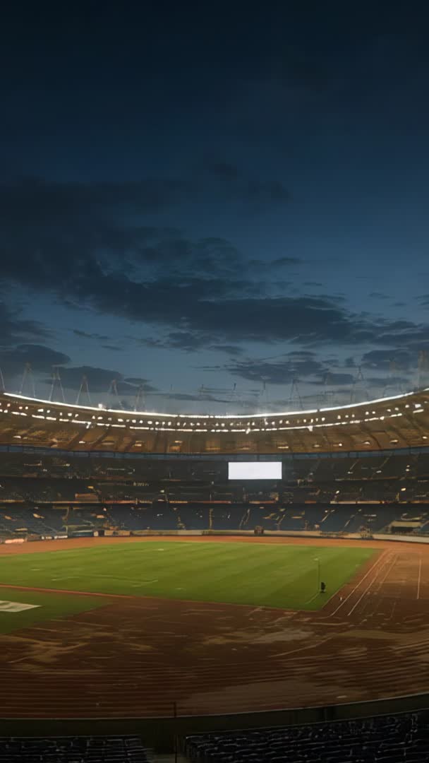 Vertical video showing worker inspecting athletics track under stadium floodlights at dusk Video