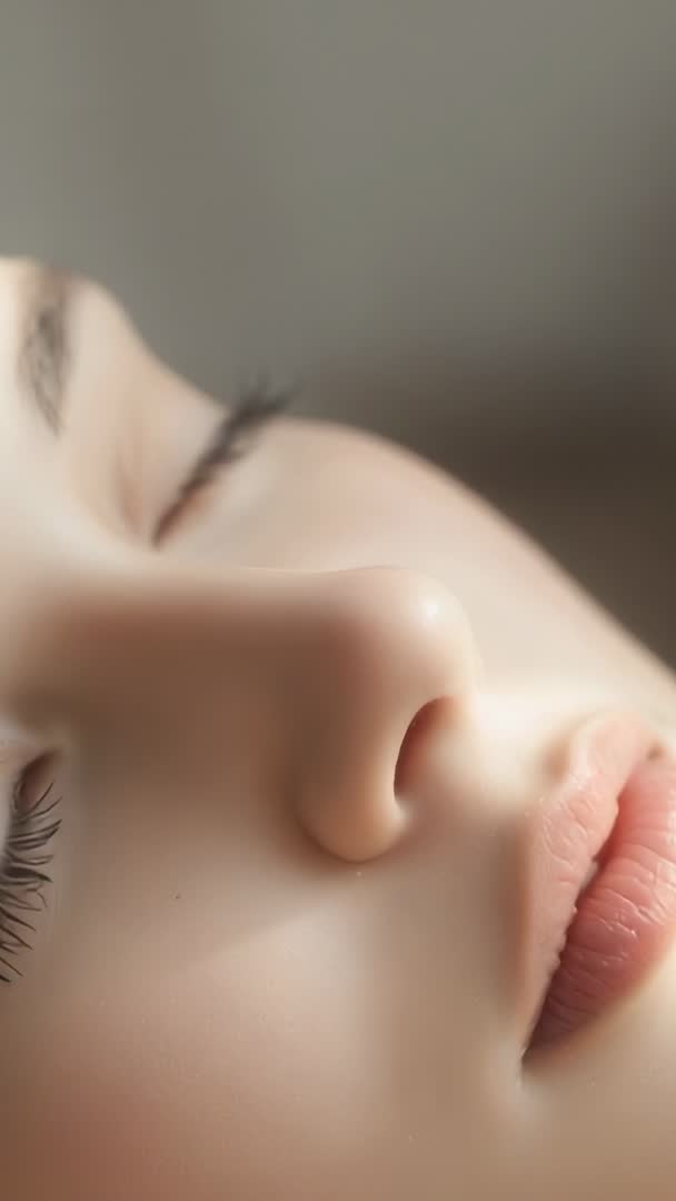 AI Generated Video. Closeup vertical video showing sleeping newborn breathing gently under soft natural light. Eyelashes resting on cheek and lips relaxed, skin tones warm and smooth. Providing intimate, peaceful mood suitable for parenting and healthcare projects. Working well for social media reels, mobile ads, pregnancy and newborn education, birth announcements, and baby product campaigns. Offering vertical format ready for short-form platforms and looping backgrounds, ideal for calming B-roll, hero clips, and emotional storytelling in family-focused content.