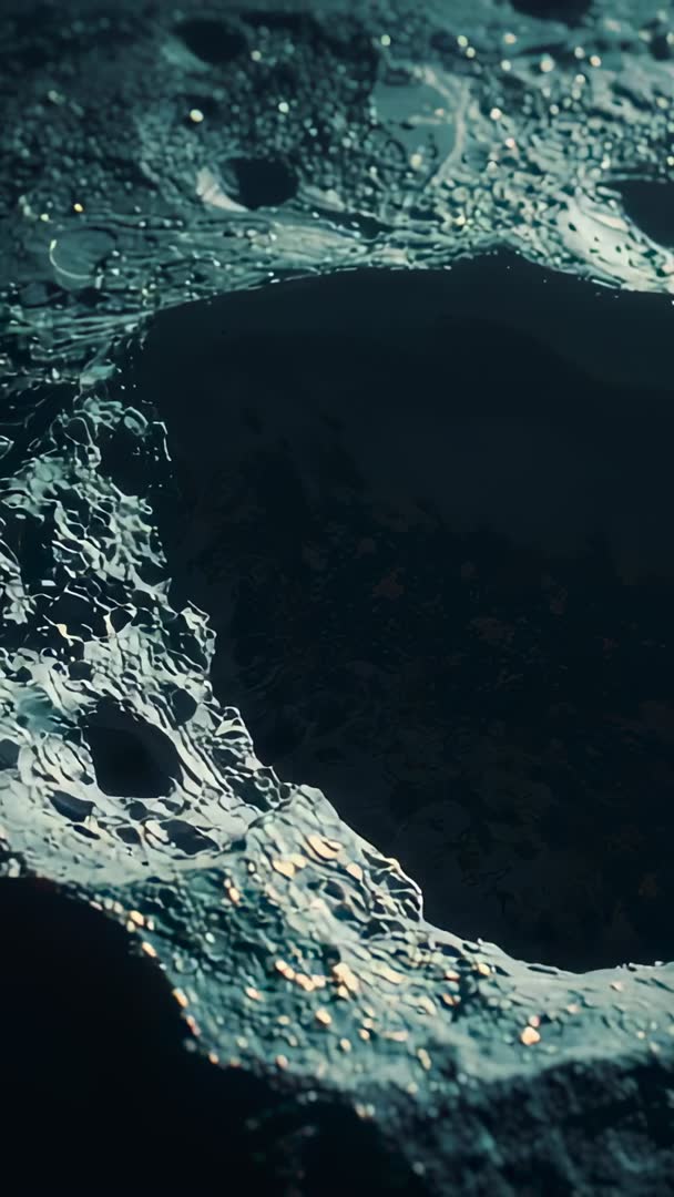 AI Generated Image. Sliding camera over jagged asteroid crater rim, revealing shadowed basin and pitted regolith at macro scale. Dark basin contrasting with reflective crater rim, creating cinematic interplay of light and shadow. Vertical format delivering tall cinematic framing ideal for smartphone and social platforms. High-detail texture and rugged topology suiting sci-fi trailers, space documentaries, planetarium visuals, VR environments, tech brand backgrounds, editorial pieces on planetary geology. Shot working well as loopable B-roll, hero background for titles, or dramatic opener for cinematic sequences. Color palette featuring deep teal tones and metallic highlights, creating moody, mysterious atmosphere. Recommended usage including appending slow zoom, adding ambient sound design, color grading for contrast, combining with graphical overlays for educational callouts, and cropping for social stories or mobile ad campaigns.