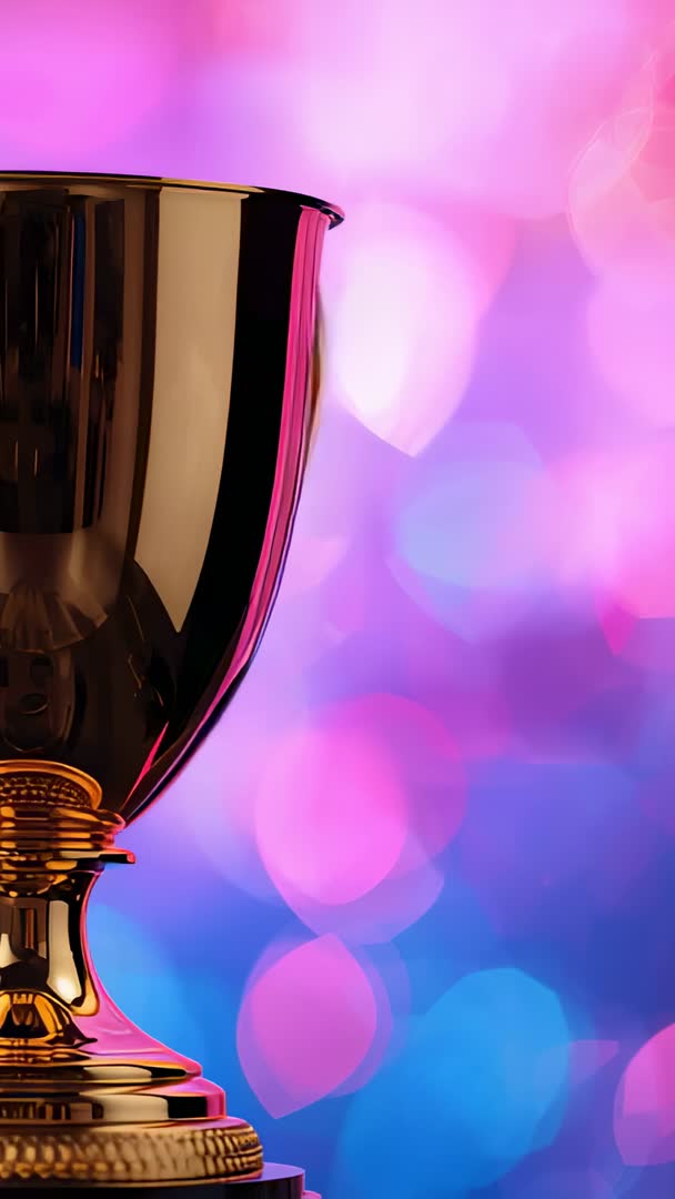 AI Generated Video. Showing sliding camera movement revealing left gold trophy cup framed against vibrant pink and blue bokeh lights. Featuring reflective metallic surface, ornate pedestal and detailed scrollwork for premium look. Leaving generous copy space on right for headline, logo or call-to-action. Ideal for award ceremony promos, corporate recognition videos, sports victory announcements, event marketing and social media stories. Optimized for vertical platforms such as Instagram Stories, TikTok Reels and Snapchat. Working well as intro clip, lower-third background, product launch spot or sponsor showcase. Offering clean highlights and rich reflections for cinematic grading and animated text overlays.
