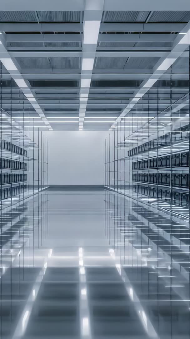 AI Generated Image. Vertical video showing camera sliding forward down mirrored corridor lined with glass panels and metal shelving, creating strong symmetry and endless reflections. Clean reflective floor and grid ceiling forming converging lines toward vanishing point, emphasizing depth and modern geometry. Cool-toned lighting and blue-gray palette conveying sterile futuristic mood. Suitable for futuristic tech promos, architecture showcases, logistics and warehousing concepts, data center or retail shelving visuals. Ideal for opener sequences, product reveal transitions, corporate presentation backgrounds, mobile ad creatives, social media reels and vertical web banners. Offering loopable movement and cinematic feel for ambient B-roll, title slates, or motion graphics overlays. Providing high visual rhythm and repeating patterns for modern branding and editorial uses.