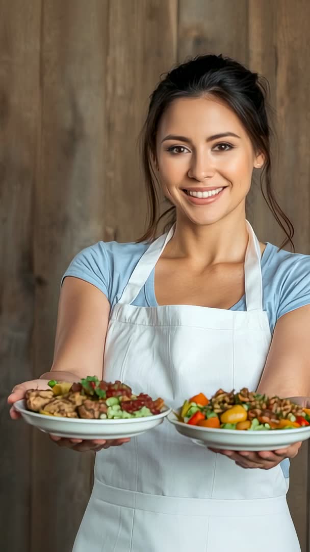 AI Generated Image. Video showing smiling female chef wearing apron and presenting two plates with grilled meat and vibrant vegetable salad against rustic wooden background. Close composition focusing on chef facial expression and hands holding dishes, shallow depth of field highlighting food textures. Useful for promoting restaurant menu, mobile-friendly recipe tutorial, chef profile clip, hospitality training, food delivery app, social media content for Instagram Reels and TikTok. Pairing with upbeat music and on-screen text promoting farm-to-table ingredients, daily specials, cooking class signups. Clip allowing cropping for portrait formats, still-frame extraction for hero banners, thumbnails, recipe card layouts. Ideal for commercial marketing, editorial culinary articles, website hero sections and in-app banners.