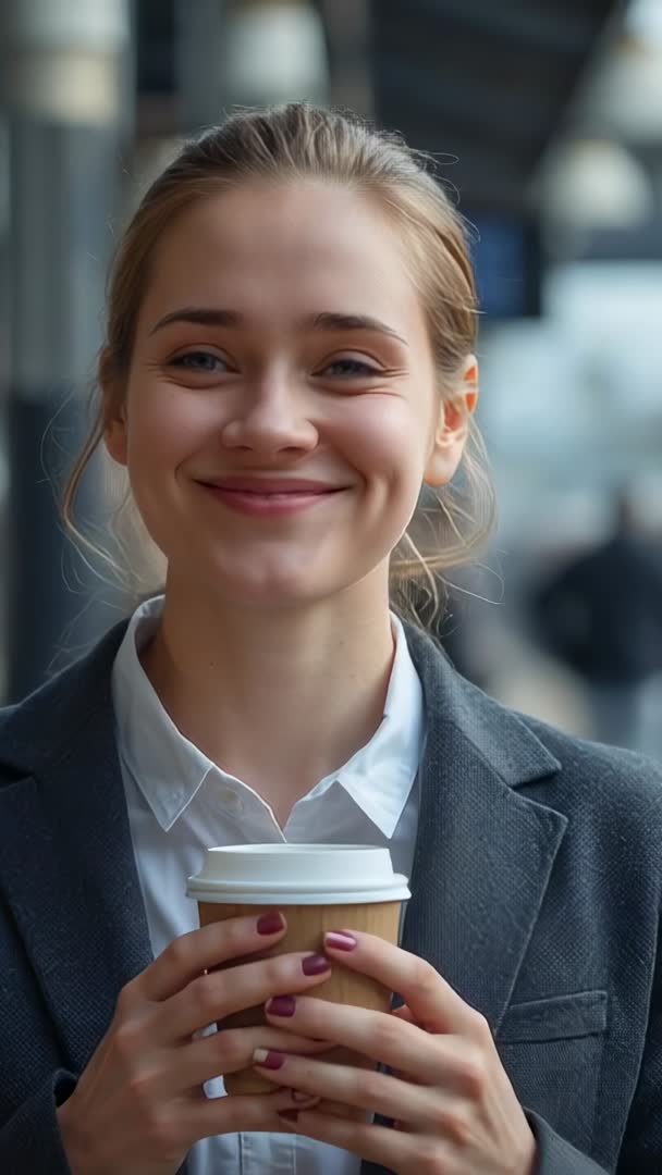 - Vertical video: Smiling commuter holding coffee on transit platform, professional morning