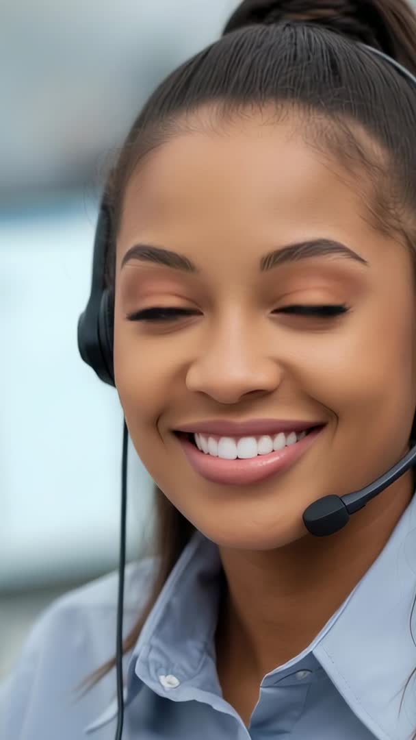 AI Generated Image. Closeup vertical video featuring smiling customer service agent speaking into headset mic while working at modern office desk. Light blue shirt and headset microphone visible, friendly expression and relaxed pose conveying helpful support during call. Eyes slightly closed and bright smile creating warm, trusting mood for customer-facing brand content. Ideal for use on contact page, customer support landing page, app onboarding video, social media vertical ad, corporate training, recruitment campaign. Recommend adding captions or subtitles, overlaying phone number or call-to-action, pairing with upbeat background music and warm color grade to enhance engagement. Clip working well for looping short intro, hero banner, mobile story format, or vertical ad placements. Technical suggestions: deliver in 9:16 aspect ratio, 1080x1920 resolution, H.264 codec, 20-30 second runtime for social ads.
