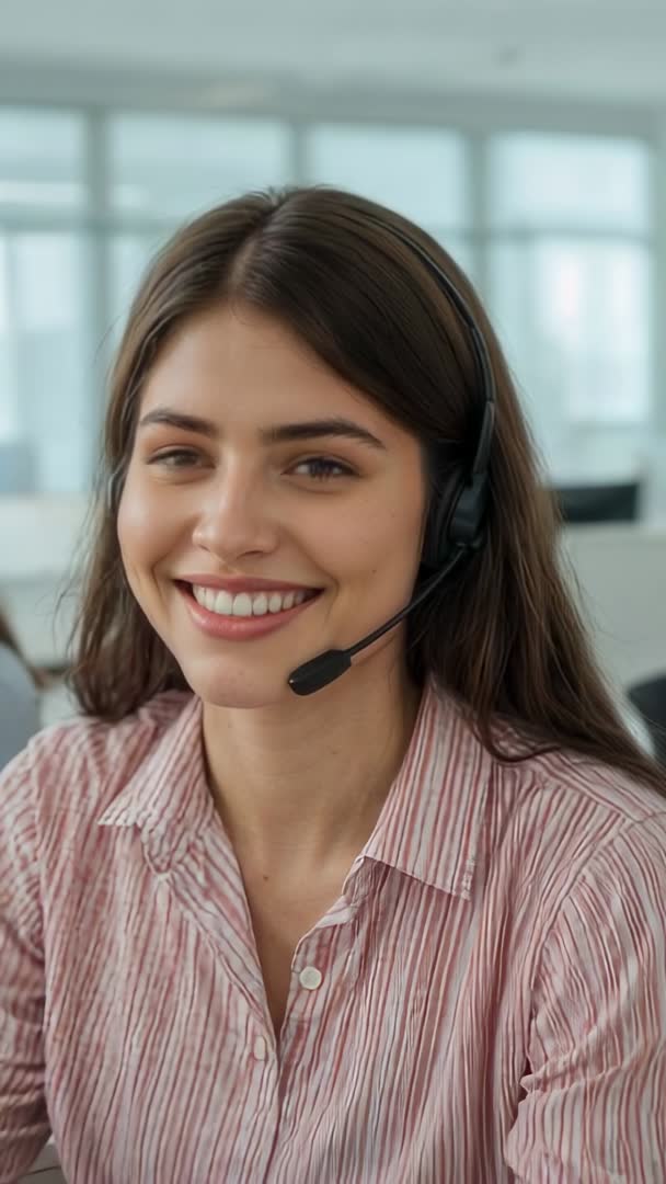 - Vertical video: Smiling customer service agent wearing headset listening in modern office