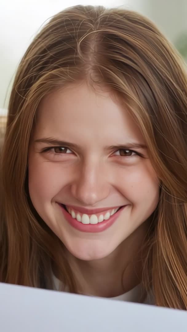 AI Generated Image. Close-up vertical video clip showing smiling woman reading note and reacting with joyful expression and warm smile. Natural light and indoor plant adding fresh, relaxed vibe. Authentic candid emotion making clip ideal for social media stories, Instagram Reels, TikTok, and mobile ads. Useful for greeting card promos, customer testimonial reels, mental health or wellbeing campaigns, lifestyle blog headers, and email marketing. Crop- and text-friendly negative space available at bottom for headlines or call-to-action. Short loopable clip working well in vertical ad units and mobile-first platforms. Color grading carrying warm tones for friendly, inviting mood and easy integration with brand assets.