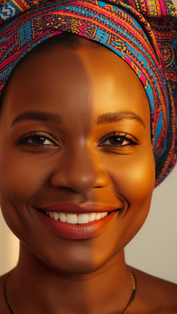 AI Generated Video. Vertical video showing closeup of smiling woman wearing colorful headwrap, tilting head left while reacting to camera cue. Warm golden studio light creating soft glow on skin, highlighting smile, eye contact, and facial texture. Composition capturing confident, authentic expression suitable for lifestyle, beauty, and fashion storytelling. Working well for social media reels, influencer content, mobile ads, and brand campaigns emphasizing warmth and approachability. Suggested uses: website hero video, Instagram Reels, TikTok content, stock footage for commercials, diversity and inclusion campaigns, editorial portrait sequences.