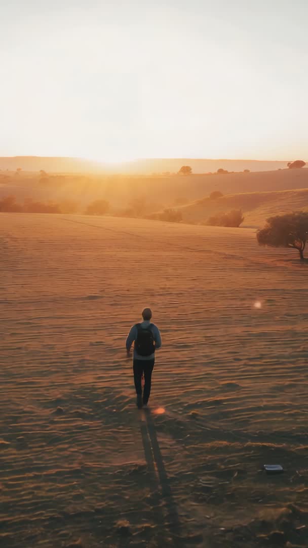 AI Generated Video. Solo hiker walking toward horizon across golden dunes at sunrise, casting long shadow and leaving footprints in rippled sand. Warm backlighting creating dramatic silhouette and lens flare, emphasizing scale and solitude of landscape. Vertical composition fitting mobile-first content and social platforms, with calm pacing and cinematic golden tones. Use for travel promos, adventure vlogs, outdoor gear commercials, wellness and mindfulness campaigns, inspirational quote overlays, website hero videos, app launch screens, or background loop for vertical ads. Color grading options: preserve warm golden tones for uplifting feel or mute colors for moody cinematic look. Clip working well as opening shot for journey storytelling, aerial transition, or seasonal campaign visuals.