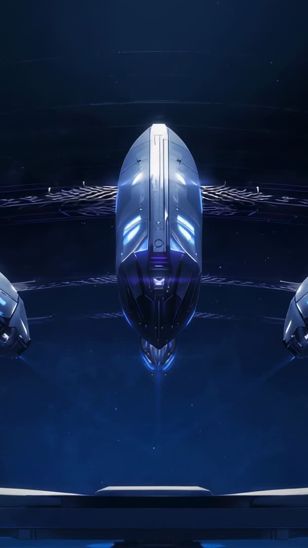 AI Generated Video. Vertical video showing spacecraft booting on orbital dock. Central vessel hull glowing blue while flank pods powering and launch ring charging with arcing energy beams. Camera performing slow upward reveal and steady center framing for dramatic countdown feel. Lighting creating cinematic neon-blue palette and reflective metallic surfaces. Footage working well for sci-fi trailers, game intros, technology product launches, app splash screens, social vertical ads, title sequences, pitch decks. Visuals providing loop-friendly motion and easy editing for overlaying text, HUD elements, music cues. Use for marketing reels, UX backgrounds, concept demos, VFX compositing, broadcast bumpers, investor presentations.