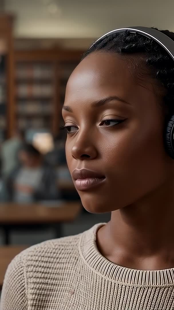 AI Generated Video. Showing closeup portrait of young woman wearing over-ear headphones inside quiet library. Filming vertical format with shallow depth of field and warm neutral tones. Capturing subtle head tilt and slow blink as subject responds to audio cue while studying. Featuring natural expression with blurred students and bookshelves in background for contextual depth. Ideal for educational content, e-learning promos, campus life features, headphone product demos, mindfulness and focus campaigns. Working well for social media vertical ads, Instagram Reels, TikTok, mobile landing pages, online course intros. Suggest trimming clip for short form highlights (head tilt, blink, profile reveal) and pairing with light instrumental track or soft library ambience. Recommend color grading for warm skin tones, adding gentle ambient noise, and including short caption or call to action for higher engagement.