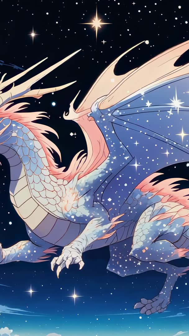 - Vertical video: Stylized cosmic dragon gliding through starry pastel sky with luminous wings