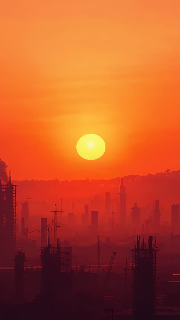 AI Generated Image. Video opening with sun hovering above horizon, cranes and chimneys forming layered silhouettes under intense orange haze. Warm color palette and strong contrast creating dramatic, moody atmosphere, evoking industry, energy, urban growth, environmental impact. Perfect for background footage in environmental reports, industrial documentaries, corporate presentations, urban planning visuals, advertising campaigns, social media vertical reels. Working well with overlay text, lower thirds, slow-motion ambient soundtrack, color grading, parallax animations for building cinematic openers or app background loops.