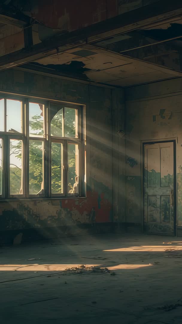 AI Generated Image. Vertical video showing golden sunbeams streaming through arched window into dusty abandoned room with weathered door. Dust motes floating through light, peeling paint flaking from walls, cracked plaster exposing wooden laths, and broken glass scattered along windowsill. Outside green trees visible through broken panes, creating contrast between lush exterior and decaying interior. Camera holding steady on empty floor as light beams slice across worn floorboards and scattered debris, revealing texture and weathering. Footage suiting urban exploration, documentary sequences, film openers, music video intros, nostalgic or post-apocalyptic storytelling, and background for title cards or book covers. Ideal for vertical reels, social media ads, mobile backgrounds, atmospheric transitions, and architecture restoration campaigns. Editing suggestions including slow push-in, subtle parallax, warm highlight grading, and ambient sound design with soft wind and distant birds to enhance mood. Licensing recommending editorial or commercial use for creative projects, marketing campaigns, and visual mood boards.