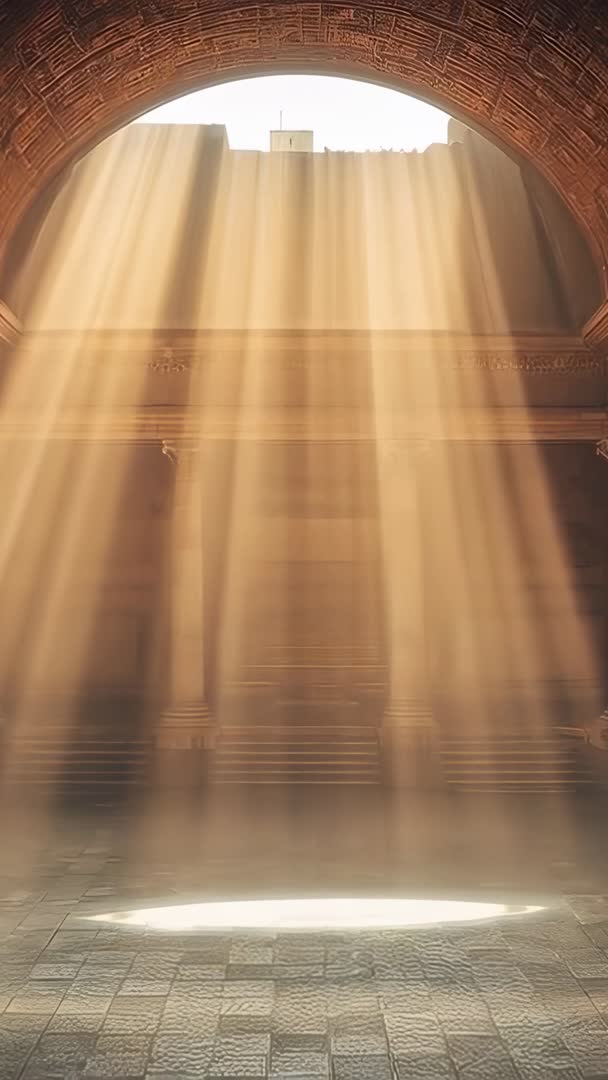 AI Generated Video. Vertical video showing sunbeams streaming through oculus into rotunda, creating dramatic shafts of light and circular lit patch on stone floor. Dust motes drifting through warm golden haze, emphasizing depth and texture of brick vault and classical columns. Camera framing vertical 9:16 orientation, ideal for mobile-first platforms and social reels. Use for cinematic openers, spiritual or meditation backgrounds, architectural documentary sequences, museum promotional clips, or ambient loops for websites and digital displays. Recommended editing approaches: slow motion or subtle dolly-in, gentle warm amber color grade, soft ambient soundtrack and light particle overlays to enhance mood. Compose overlay text in upper third to avoid obscuring light beams and keep subject centered for safe vertical crop. Clip working well for title cards, transitions, hero banners, quote backgrounds, sermon visuals, and inspirational social content.