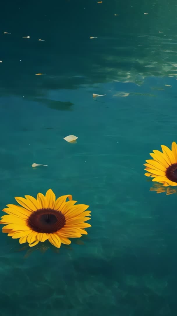 - Vertical video: Sunflowers floating on rippling turquoise water, serene minimalist relaxation
