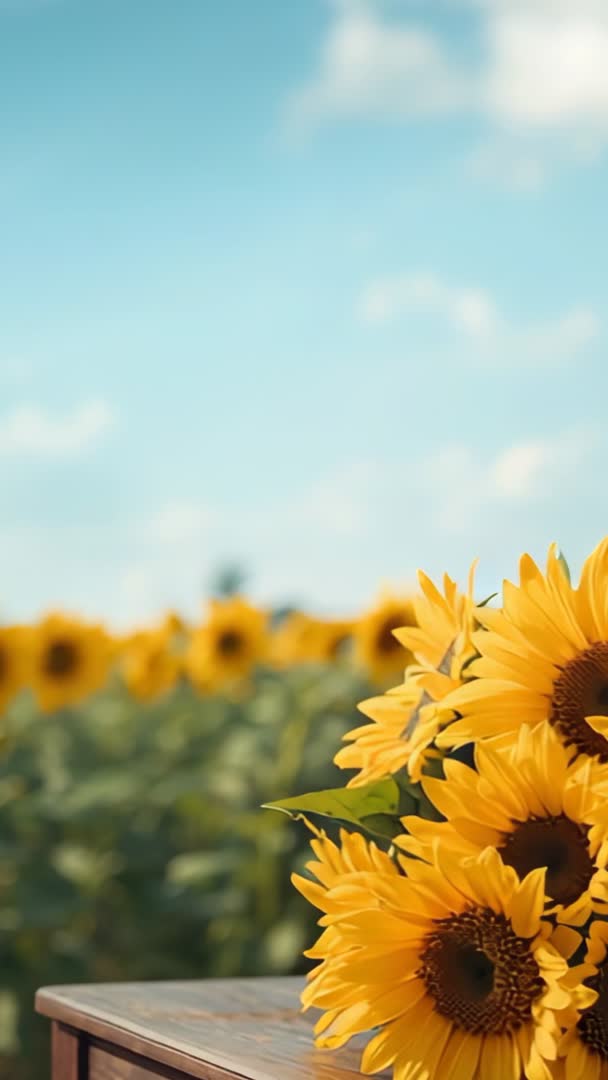 AI Generated Image. Featuring sunflower bouquet rustling in gentle breeze on rustic wooden table, with distant sunflower field and soft blue sky offering generous vertical copy space. Composition placing bouquet in lower right corner and sky in upper area creating natural room for text, logos, or animated graphics. Warm golden tones and shallow depth of field creating cozy pastoral mood and strong seasonal summer vibe. Ideal for vertical formats such as social media reels, stories, mobile ads, and product promos for florists, farm shops, and eco brands. Useful for hero clips on lifestyle blogs, seasonal marketing, greeting cards, wellness and mindfulness content, and background for inspirational quotes. Editing suggestions: extend sky area for text overlays, add slow pan or gentle zoom to emphasize motion, or loop short segment for seamless background. Color grading suggestions: boost warm highlights while maintaining soft blues for pleasing contrast and bright, uplifting feel.
