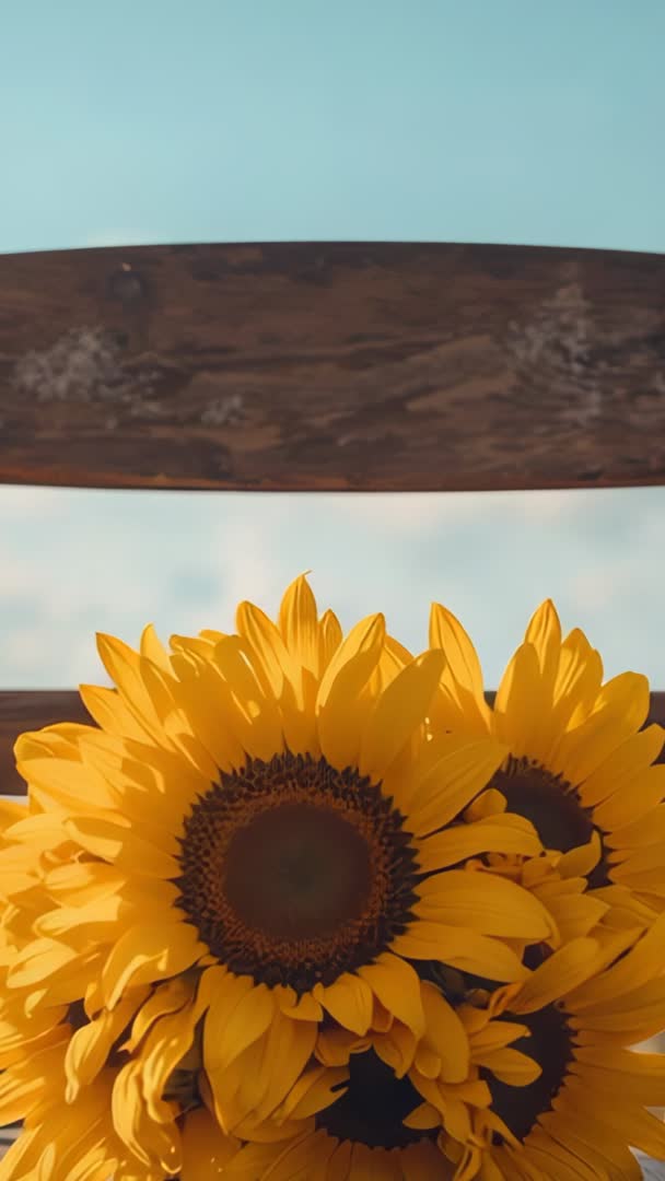 AI Generated Image. Vertical video showing sunlit sunflowers resting on rustic wooden bench, camera tilting and zooming to focus on petals and central disk, capturing warm golden tones and soft backlight. Composition emphasizing close-up detail, shallow depth of field, gentle motion and cinematic pacing. Ideal for social media reels, mobile ads, florist promotions, seasonal marketing, wellness and mindfulness content, lifestyle blogs, hero banners for websites. Suitable for backgrounds, title screens, product overlays, greeting cards, floral workshop tutorials. Providing color palette inspiration and calming mood visuals for editorial and commercial projects.