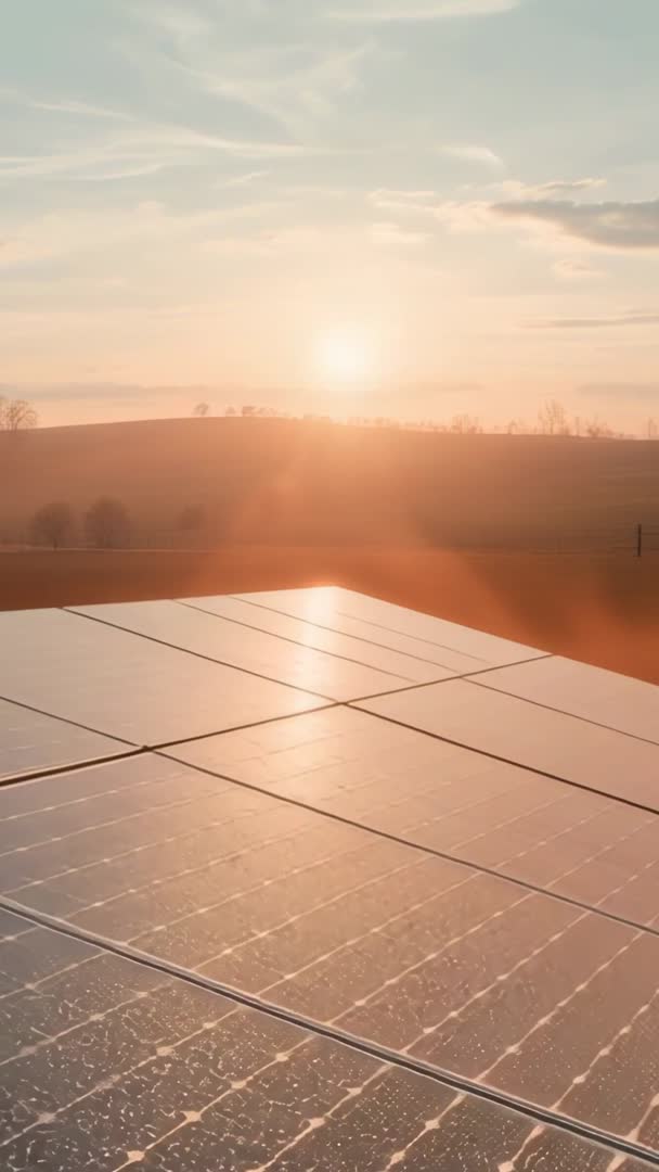 - Vertical video Sunrise casting golden light across solar panel array on rolling farmland