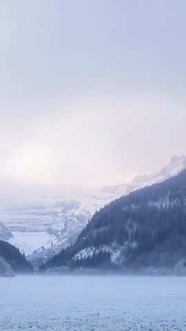 AI Generated Video. Vertical format video showing soft sunrise glow revealing frozen alpine lake with mist thinning over pine-covered ridge and valley. Slow gentle motion and cool blue tones creating tranquil, cinematic mood suitable for mobile screens and vertical social media reels. Ideal for travel promos, winter tourism marketing, meditation apps, wellness and spa backgrounds, real estate or resort advertising, environmental and climate storytelling. Working as B-roll for documentary or news segments about mountain weather and winter landscapes, or serving as looping background for storefront displays and digital signage. Editing suggestions: applying gentle color grading toward cool blues, using subtle fade-in, adding ambient wind or soft piano music for mood.