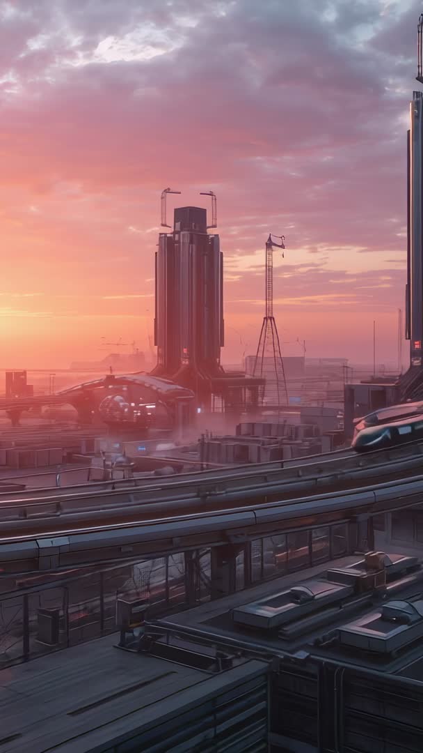AI Generated Image. Vertical video showing sunrise panning across futuristic waterfront transit hub, featuring elevated monorail gliding along curved rail tracks past towering skyscrapers. Warm sunrise light bathing scene in pink and orange hues while blue train lights providing vivid contrast. Tall cinematic composition suiting mobile vertical platforms and short-form social content. Use for tech and transport commercials, sci-fi film openers, mobile app intros, urban planning presentations, or background for title sequences. Edit tips: loop segment for seamless background, apply gentle speed ramp during train pass, overlay minimal text at top or bottom to preserve vertical framing. Deliverables: ideal for 9:16 format, color grade for warmer tones, add ambient sound design and subtle motion blur for higher impact.