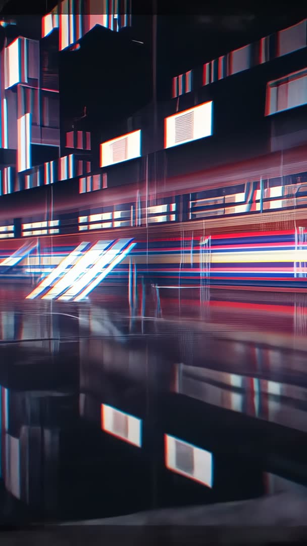 AI Generated Image. Vertical video showing sweeping camera movement through neon-lit futuristic corridor with reflective panels and glossy floor. Glitch effects and chromatic aberration creating dynamic color shifts and horizontal light streaks. Mirroring on floor doubling LED bands and adding depth. Composition using vertical orientation for mobile-friendly content and tall screens. Lighting pulsing in sync with subtle motion blur for cinematic feel. Serving as dynamic backdrop for futuristic brand campaigns, music video intros, product showcase reels, app and UI backgrounds, event visuals, social media ads, and title sequences. Allowing overlay of bold typography and logo reveal animations. Looping seamlessly for LED walls, VJ sets, and background playback. Color grading favoring cyan-magenta contrast for synthwave and cyberpunk aesthetics. Providing easy adaptation for speed ramping, text tracking, and sound design integration.
