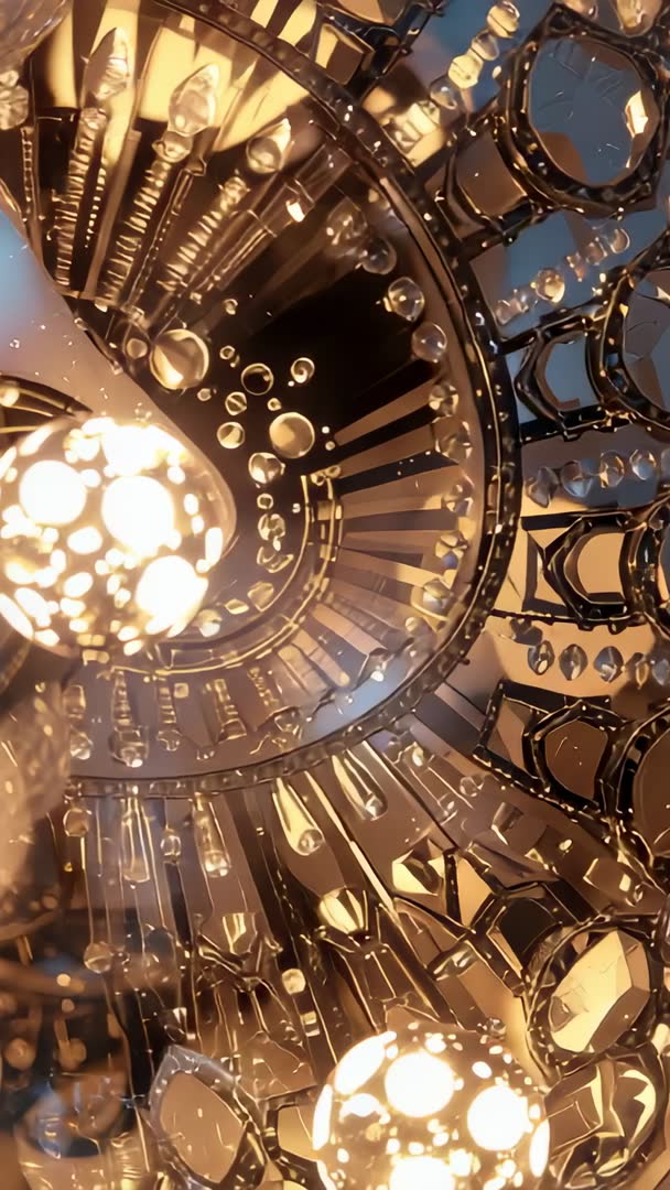 AI Generated Image. Vertical footage showing sweeping camera movement around rotating crystal chandelier, revealing dangling prisms, faceted reflections, and warm golden glow. Close-up sequences capturing light refraction, bokeh highlights, and intricate metalwork, creating sense of opulence and refinement. Footage working well for luxury hotel promos, high-end real estate tours, interior design reels, wedding venue showcases, event planning adverts, and lifestyle brand campaigns. Ideal for vertical social media formats like Instagram Stories, Reels, TikTok, and mobile ads. Use as B-roll for title sequences, mood-setting backgrounds, product launches, or animated transitions. Color palette emphasizing warm gold and amber tones, complementing upscale brand identities. Editors adjusting speed for slow-motion highlight or ramp effects for dynamic reveals.