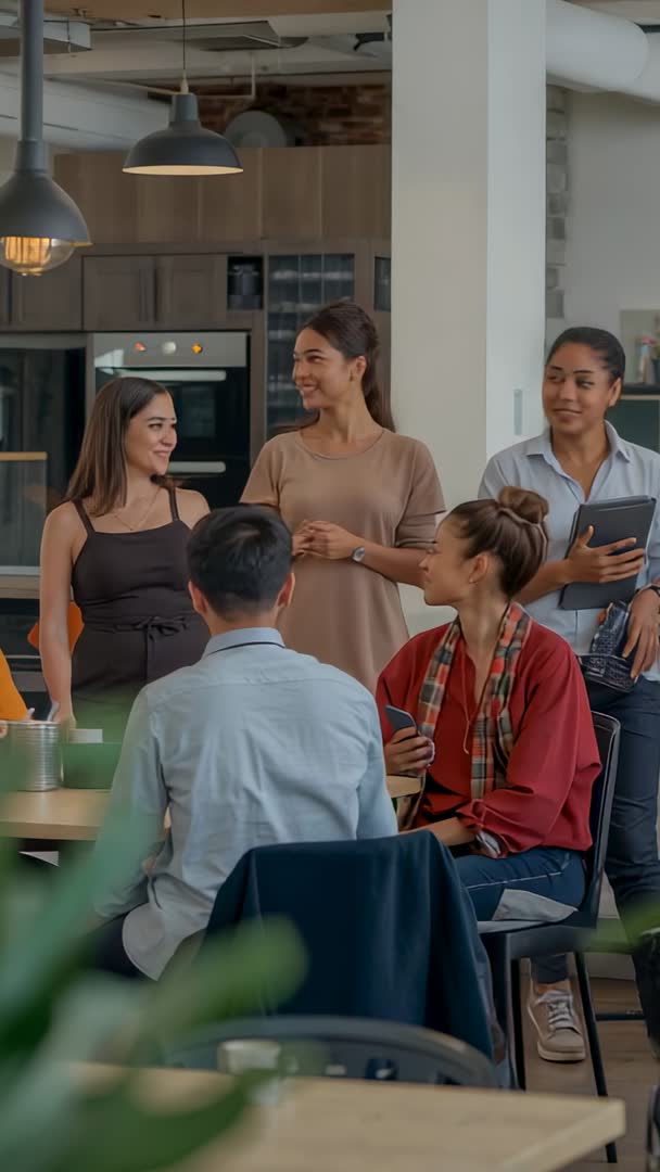 - Vertical video: Team leader presenting update in modern office kitchen while colleagues listening