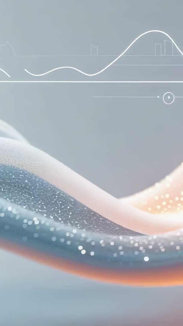 AI Generated Image. Vertical video showing pulsing ribbon and animated waveform with bars and arrow indicating data flow. Abstract digital art combining soft gradient ribbons, particle highlights and clean line graphics for futuristic tech look. Suitable for tech promo, app intro, UI demo, corporate presentation, social media story and digital signage. Delivering loopable motion graphic providing subtle moving background for text overlays, logo reveal, product launch and data storytelling. Enabling easy branding with adjustable colors and contrast for matching corporate palette. Providing high-resolution portrait format optimized for mobile viewing, Instagram Stories, TikTok ads and vertical displays.