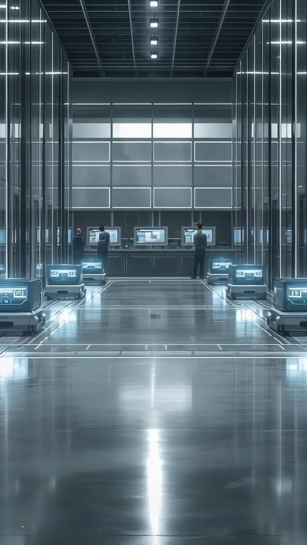 AI Generated Image. Moving vertical camera revealing two technicians in dark gear monitoring wall of screens inside futuristic datacenter. LED panels glowing blue, glass pillars rising, reflective flooring mirroring lights and equipment, autonomous carts lining aisles. Composition emphasizing symmetry, clean lines, clinical atmosphere and large scale of technical infrastructure. Useful for vertical content on TikTok, Instagram Reels, LinkedIn Stories, corporate tech presentations, cybersecurity campaigns, product demos, facility tours, film or TV B-roll. Suggested edits: adding slow motion segments, subtle camera push-in, cinematic teal-blue color grade, data overlays and lower third captions, ambient synth soundtrack for dramatic pacing.