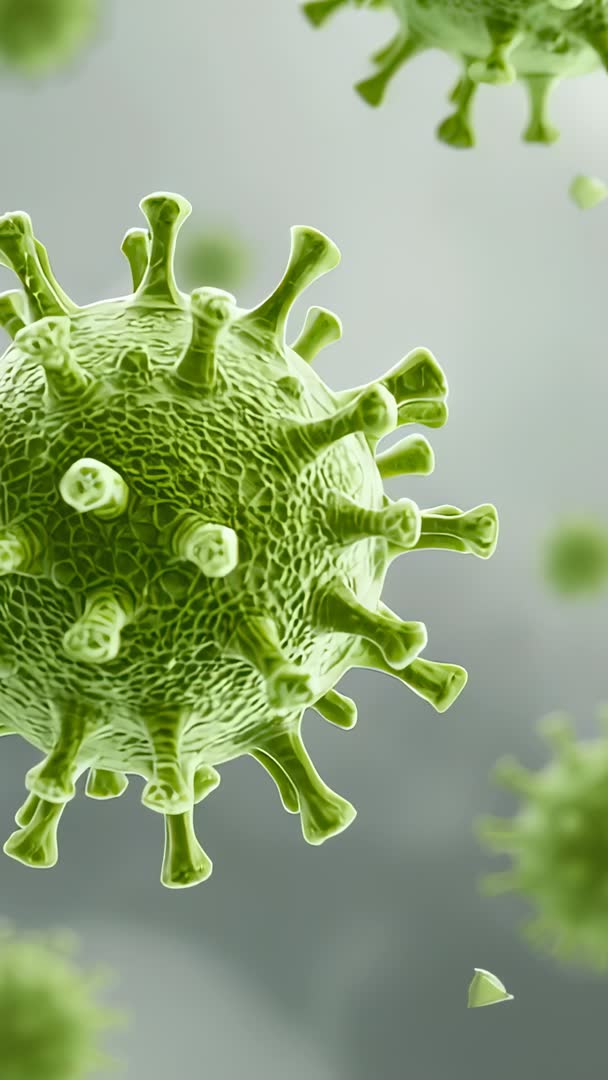 AI Generated Image. Bringing green spherical virion into tight focus, showing textured surface with pronounced spike proteins and small detached fragment drifting in foreground. Using shallow depth-of-field, soft gray-green palette, and smooth vertical motion for cinematic scientific presentation. Serving science news segments, epidemiology briefings, medical education modules, biotech marketing, public health campaigns, and social media reels. Suggesting overlay options: headline at top, caption bar at bottom, animated labels pointing to spike proteins, and slow-motion reveal for emphasis. Recommending edit ideas: loopable intro for short-form content, voiceover with key facts, infographic overlays with infection data, and color grading to match brand identity. Licensing recommendations: enabling editorial use for viral research coverage, commercial use for health tech promotion, and instructional use for classroom and e-learning.
