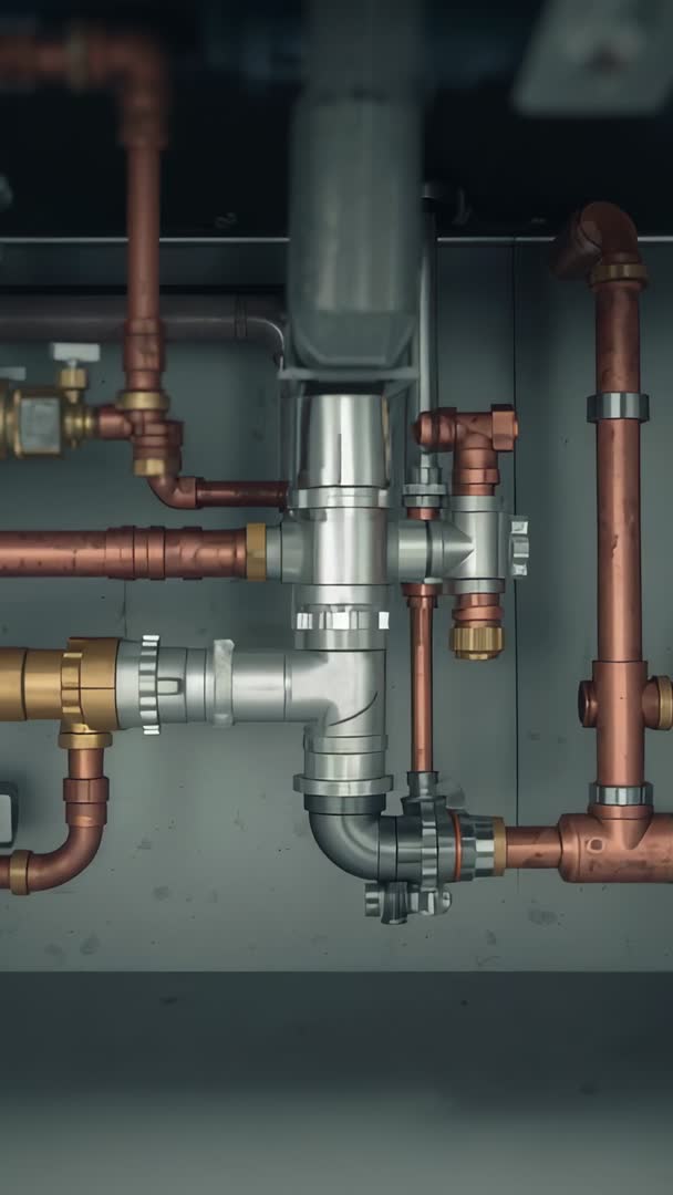 AI Generated Image. Vertical video tilting camera revealing center T-joint with network of copper and brass piping inside service chase. Close-up composition highlighting pipe intersections, elbow joints, compression fittings, and valve connections, showing contrast between polished metal and aged patina. Lighting emphasizing metallic textures and welded seams, shallow depth of field isolating central T-joint for clear focal point. Useful for plumbing tutorial videos, maintenance manuals, HVAC training, parts catalog imagery, construction progress reports, and contractor marketing. Suitable for overlaying text, annotations, animated callouts, or step-by-step repair sequence. Clean framing providing room for captions, captions, and logo placement.