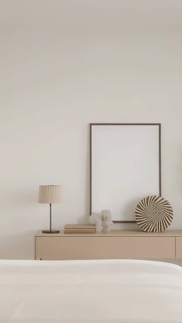 AI Generated Image. Vertical video showing slow tilt from bed toward dresser with lamp, framed blank art, stacked books and sculptural accent. Neutral beige palette and soft natural light creating calm, minimalist atmosphere. Scene working well for interior design promos, furniture catalogs, lifestyle social posts, hotel marketing and mood-setting openings for architecture or home renovation videos. Use for Instagram Reels, TikTok, website hero banners, commercial ads or background footage for voiceover. Crop-friendly for mobile with ample negative space above for text overlays and branding. Color palette matching neutral and earth-tone campaigns. Styling suggestions: pair with serif title font, warm ambient music and slow cross-dissolve transitions. Suitable for product showcase, staging portfolio, editorial interiors and real estate listings.